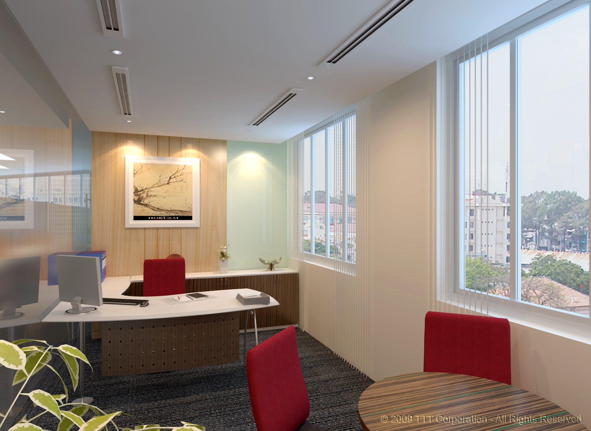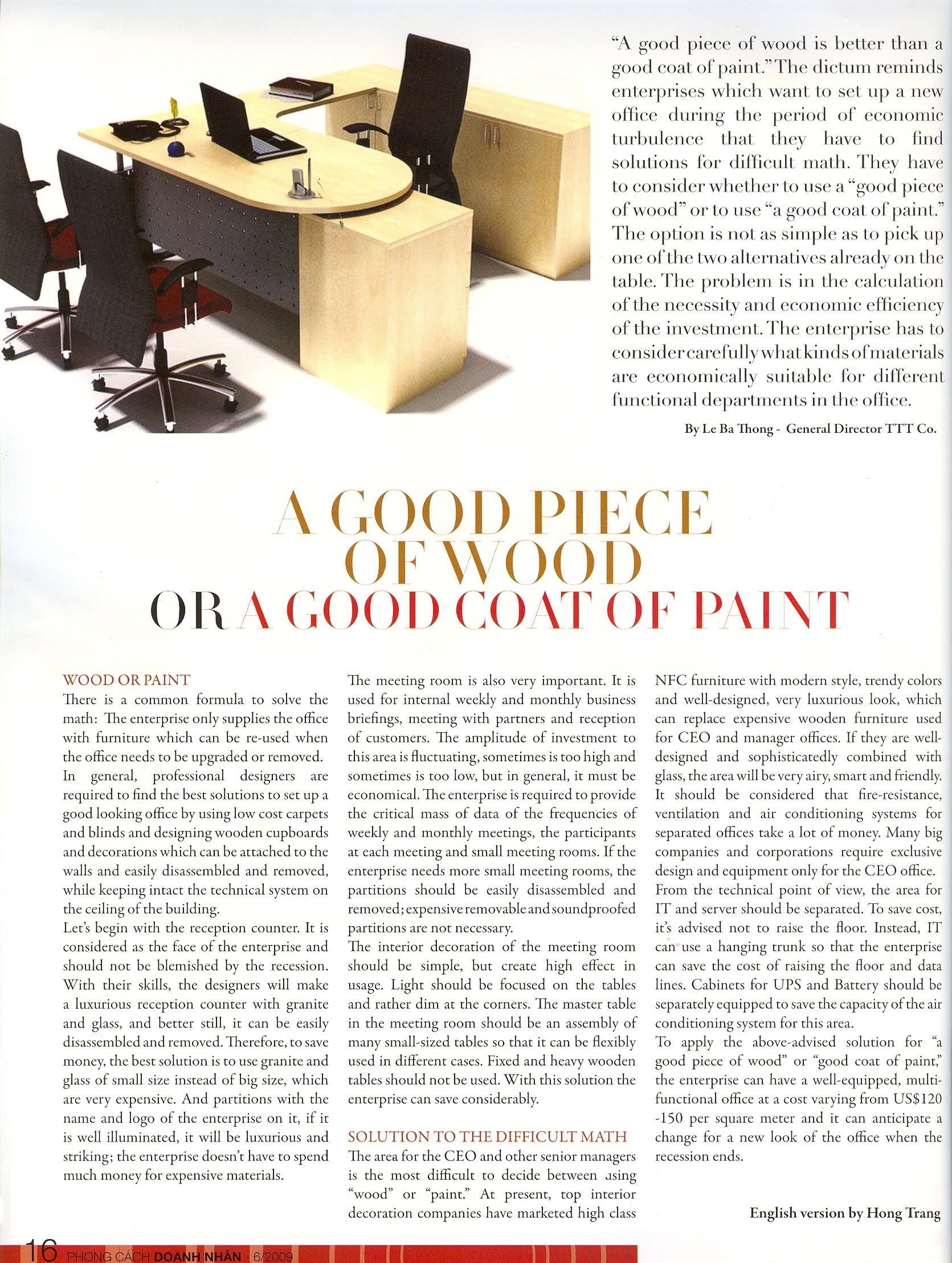 NFC furniture with modern style, trendy colors and well-designed, very luxurious look, which can replace expensive wooden furniture used for CEO and manager offices. If they are welldesigned and sophisticatedly combined with glass, the area will be very airy, smart and friendly. It should be considered that fire-resistance, ventilation and air conditioning systems for separated offices take a lot of money. Many big companies and corporations require exclusive design and equipment only for the CEO office. From the technical point of view, the area for IT and server should be separated. To save cost, it's advised not to raise the floor. Instead, IT can use a hanging trunk so that the enterprise can save the cost of raising the floor and data lines. Cabinets for UPS and Battery should be separately equipped to save the capacity of the air conditioning system for this area. To apply the above-advised solution for a good piece of wood” or “good coat of paint," the enterprise can have a well-equipped, multifunctional office at a cost varying from US$120 -150 per square meter and it can anticipate a change for a new look of the office when the recession ends.