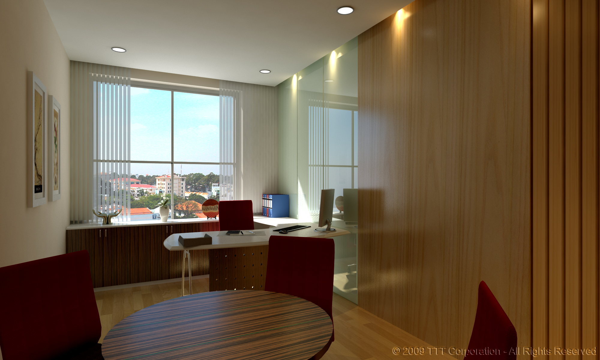 There is a common formula to solve the math: The enterprise only supplies the office with furniture which can be re-used when the office needs to be upgraded or removed. In general, professional designers are required to find the best solutions to set up a good looking office by using low cost carpets and blinds and designing wooden cupboards and decorations which can be attached to the walls and easily disassembled and removed, while keeping intact the technical system on the ceiling of the building. Let's begin with the reception counter. It is considered as the face of the enterprise and should not be blemished by the recession. With their skills, the designers will make a luxurious reception counter with granite and glass, and better still, it can be easily disassembled and removed. Therefore, to save money, the best solution is to use granite and glass of small size instead of big size, which are very expensive. And partitions with the name and logo of the enterprise on it, if it is well illuminated, it will be luxurious and striking; the enterprise doesn't have to spend much money for expensive materials.